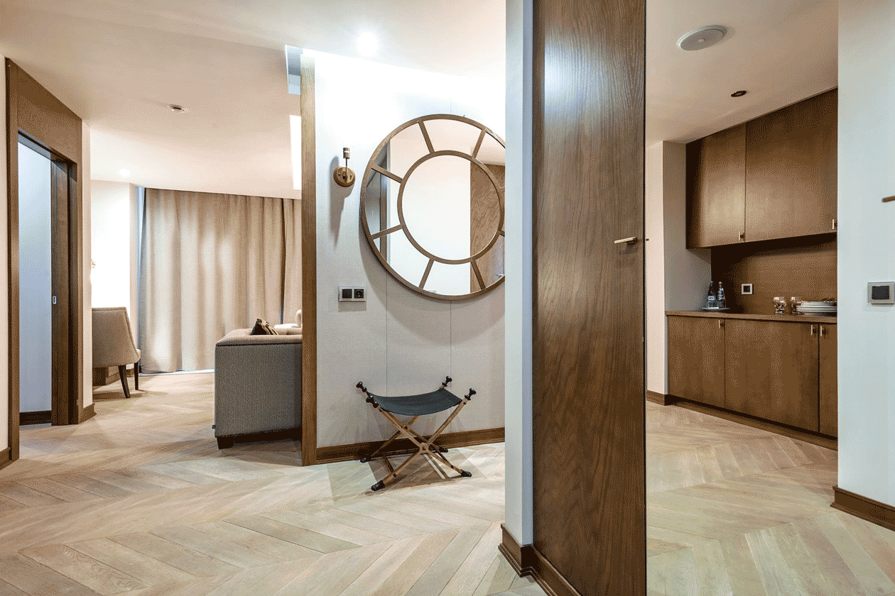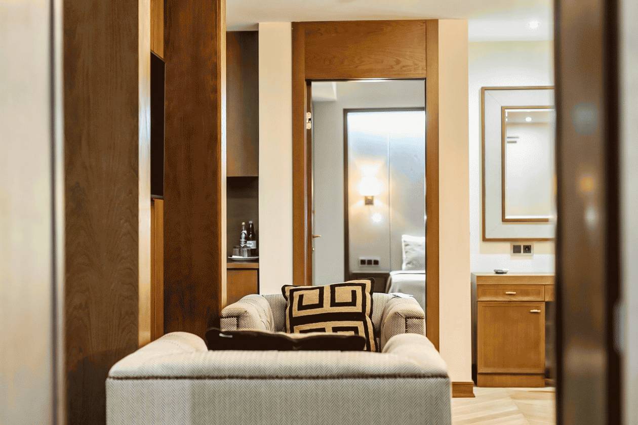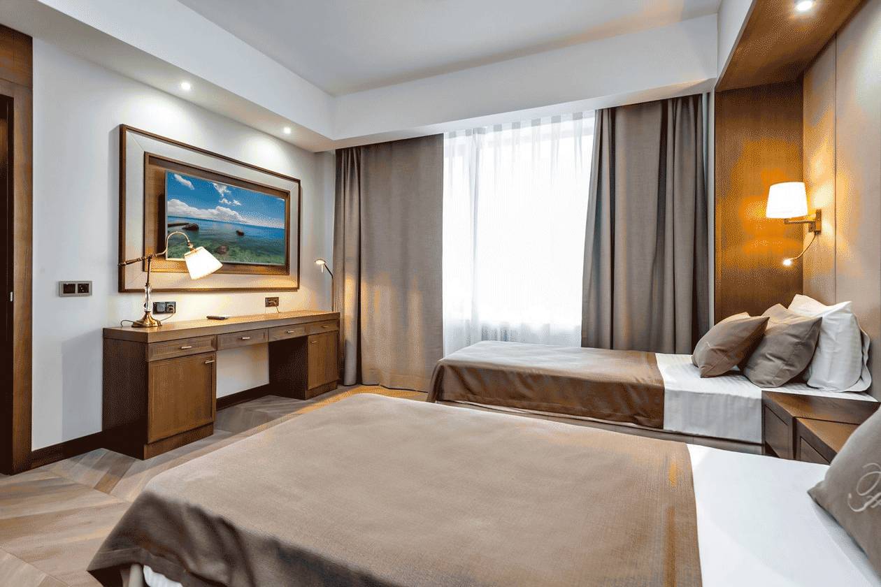 4 осн. места. 4 доп. места. Мебель: вешалка, диван, зеркало, кровать двуспальная (с возможностью разделения на две односпальных кровати), прикроватные тумбочки, стол, стулья, тумба, шкаф. Оборудование: кондиционер, мини-холодильник, набор посуды, телевизор, электрочайник. Санузел: 3 санузла, с душем, тапочки, туалетные принадлежности, фен, халат. Сервис: Wi-Fi бесплатно, смена полотенец, смена постельного белья, уборка номера, услуги внутренней телефонной связи.