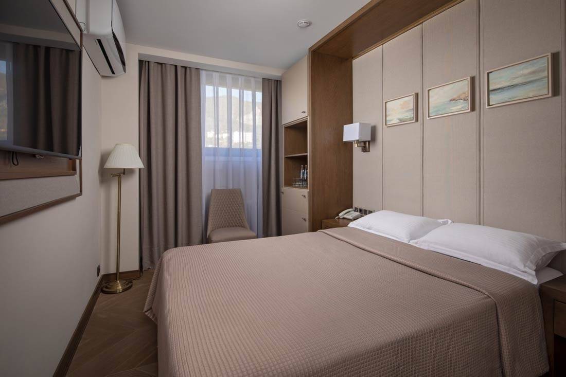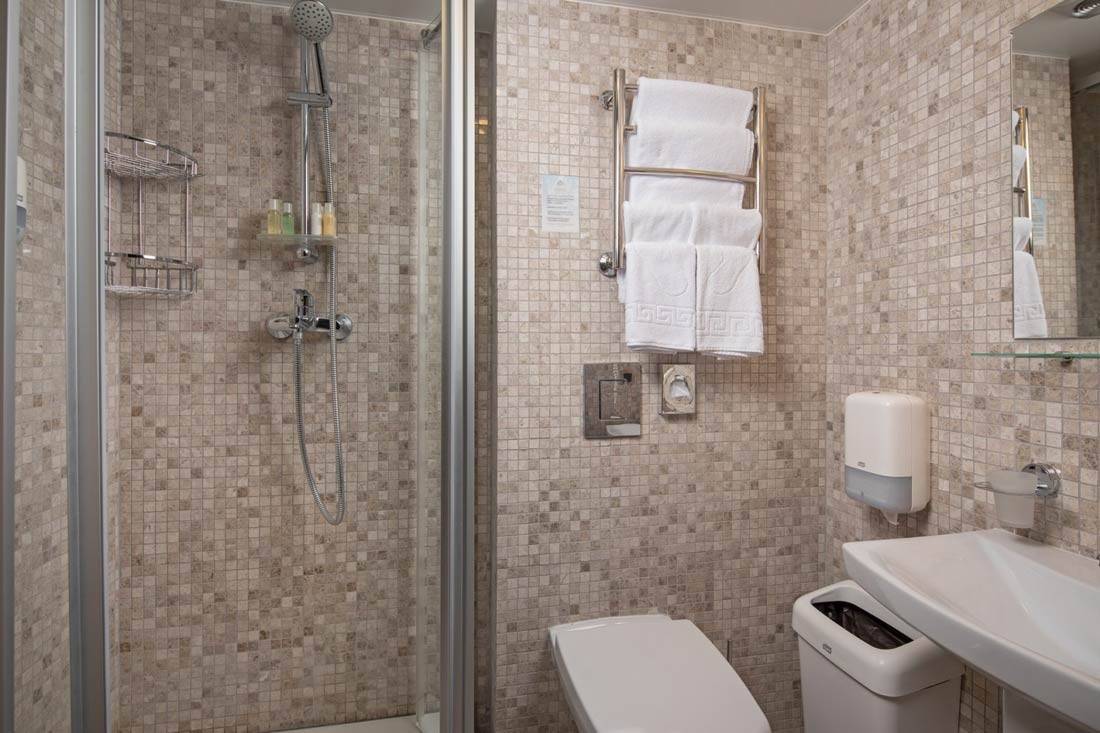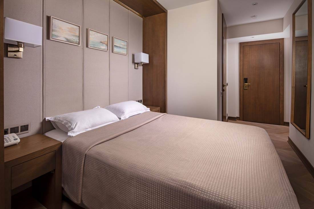 Площадь номера - 15 кв.м. 1 осн. место. Мебель: вешалка, зеркало, кровать полутороспальная, прикроватные тумбочки, стул, шкаф. Оборудование: кондиционер, мини-холодильник, набор посуды, сейф, телевизор, телефон, электрочайник. Санузел: с душем, тапочки, туалетные принадлежности, фен, халат. Сервис: Wi-Fi бесплатно, смена полотенец, смена постельного белья, уборка номера, услуги внутренней телефонной связи.