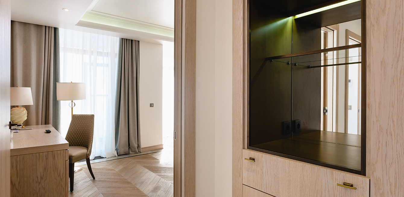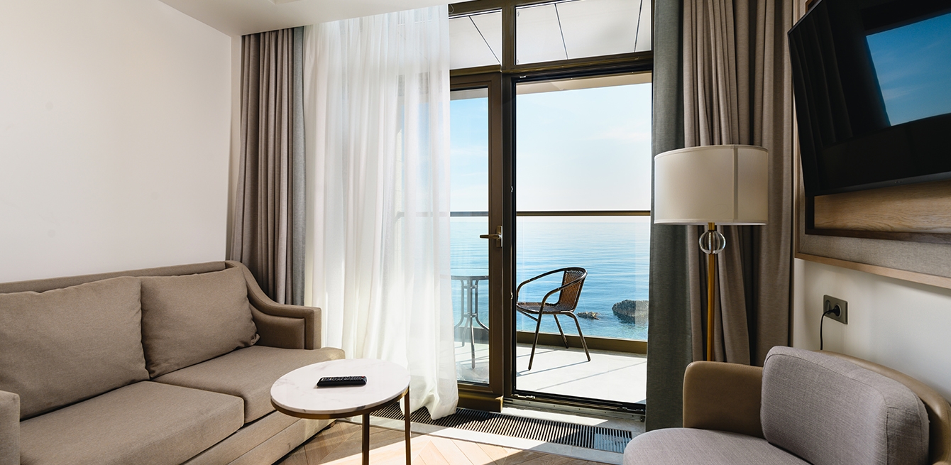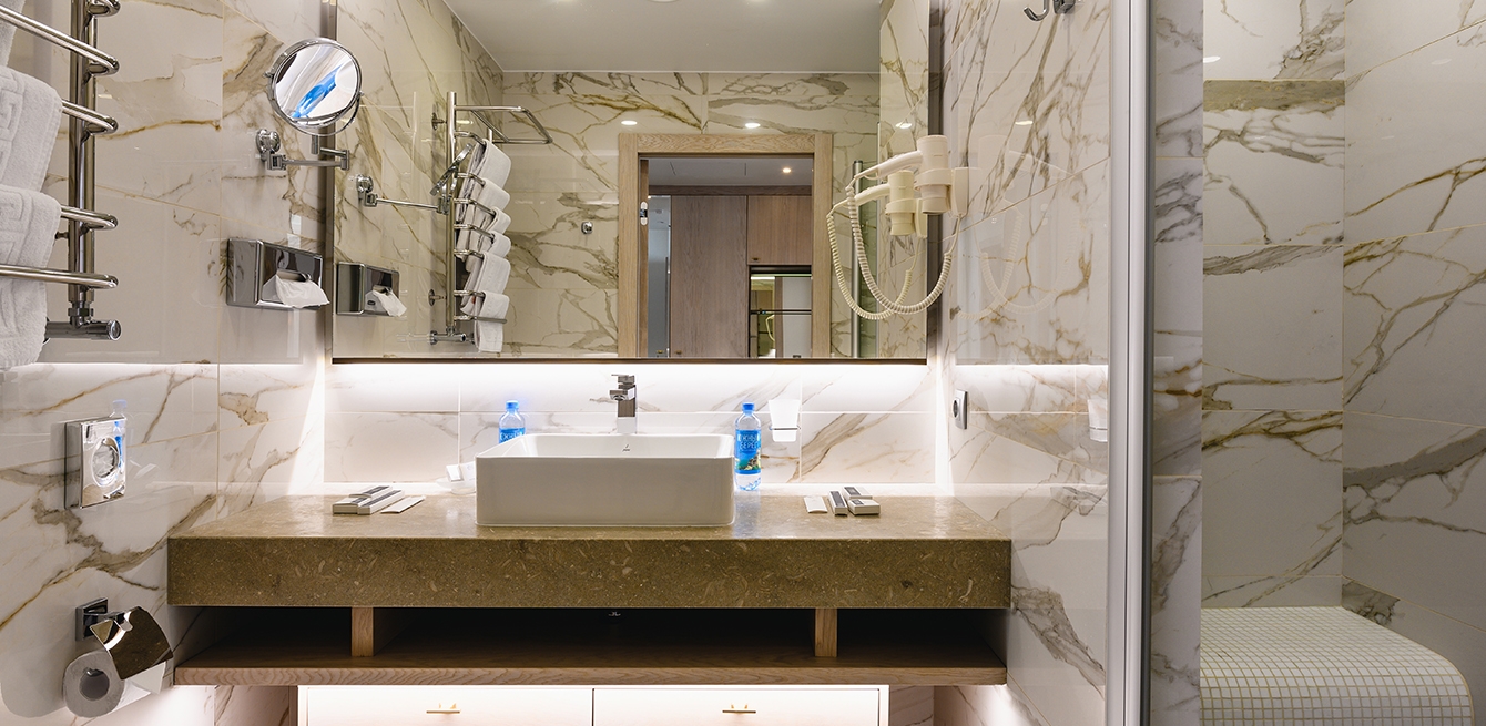 Площадь номера - 41 кв.м. 2 осн. места. 3 доп. места. Балкон. Мебель: вешалка, диван, зеркало, кресло, кровать двуспальная (с возможностью разделения на две односпальных кровати), прикроватные тумбочки, стол, стулья, шкаф. Оборудование: кондиционер, мини-холодильник, набор посуды, сейф, телевизор, телефон, электрочайник. Санузел: с душем, тапочки, туалетные принадлежности, фен, халат. Сервис: Wi-Fi бесплатно, смена полотенец, смена постельного белья, уборка номера, услуги внутренней телефонной связи.